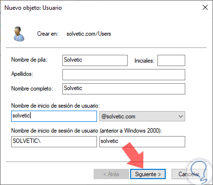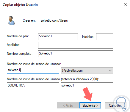 Procedemos a crear el nuevo usuario según sea necesario. Pulsamos en "Siguiente".