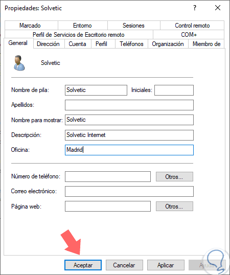 Asimismo, podemos ingresar todos los datos que consideremos necesarios para tal usuario. Definido esto pulsamos en el botón "Aplicar y Aceptar" para guardar los cambios.
