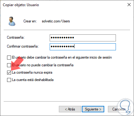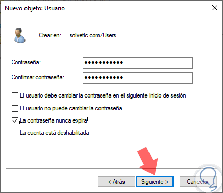 A continuación asignamos la contraseña y definimos la forma como se administrará la cuenta, esto implica definir si la cuenta estará deshabilitada, si el usuario debe cambiar la contraseña, etc. Pulsamos de nuevo en "Siguiente".