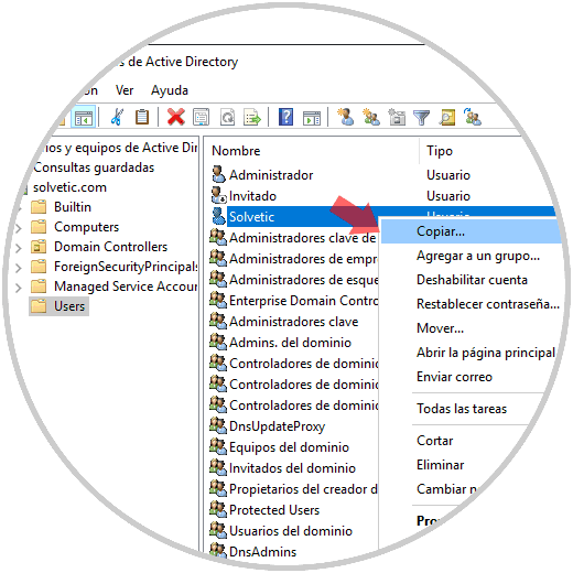 Ahora daremos clic derecho sobre el usuario creado y editado y seleccionamos la opción "Copiar":