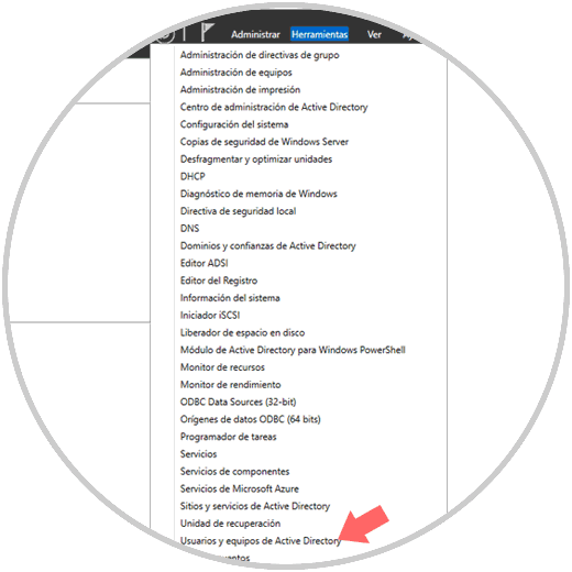 Para iniciar este proceso iremos al "Administrador del servidor" y allí, en el menú "Herramientas", seleccionamos la opción "Usuarios y equipos de Active Directory":