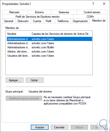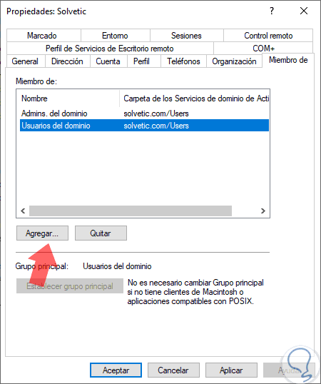 Ahora daremos doble clic sobre el nuevo usuario y en la ventana desplegada vamos a la pestaña "Miembro de" para agregar los grupos en los cuales van a estar los usuarios. Allí podemos pulsar en el botón "Agregar" para ingresar todos los grupos requeridos.