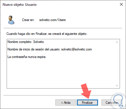 Podemos ver que la opción definida en el usuario anterior esta aplicada, en este caso "La contraseña nunca expira". Pulsamos en "Siguiente". Luego en "Finalizar" para completar la creación del usuario.