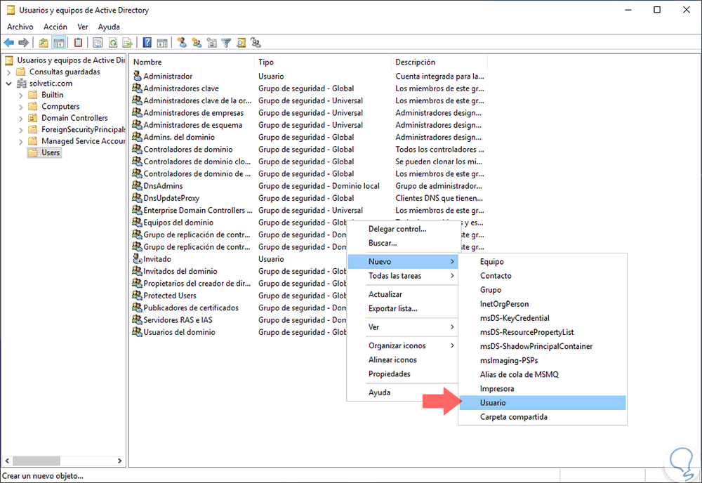 En la consola que se desplegará, iremos a la sección "Users" y allí daremos clic derecho en algún lugar libre para seleccionar la opción "Nuevo" / "Usuario":