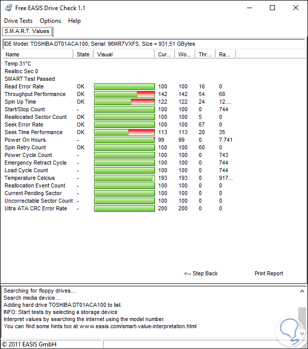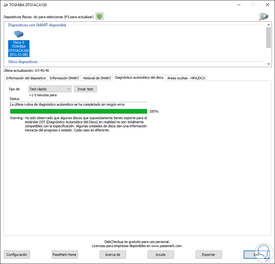 - S.M.A.R.T. Test: este es un análisis rápido, tarda entre 20 a 30 segundos y despliega detalles como temperatura, modelo, capacidad y una serie de comprobaciones generales