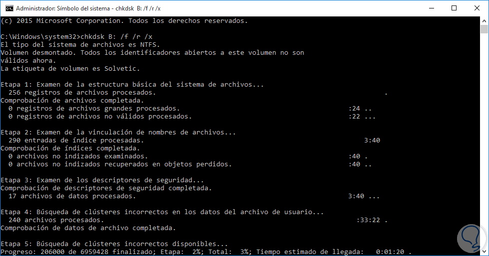 CHKDSK nos ofrece diversos parámetros para verificar si existen errores en él, estas opciones son: