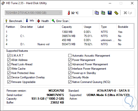 Allí podemos navegar entre las diferentes pestañas para observar detalles mas completos del disco duro seleccionado: