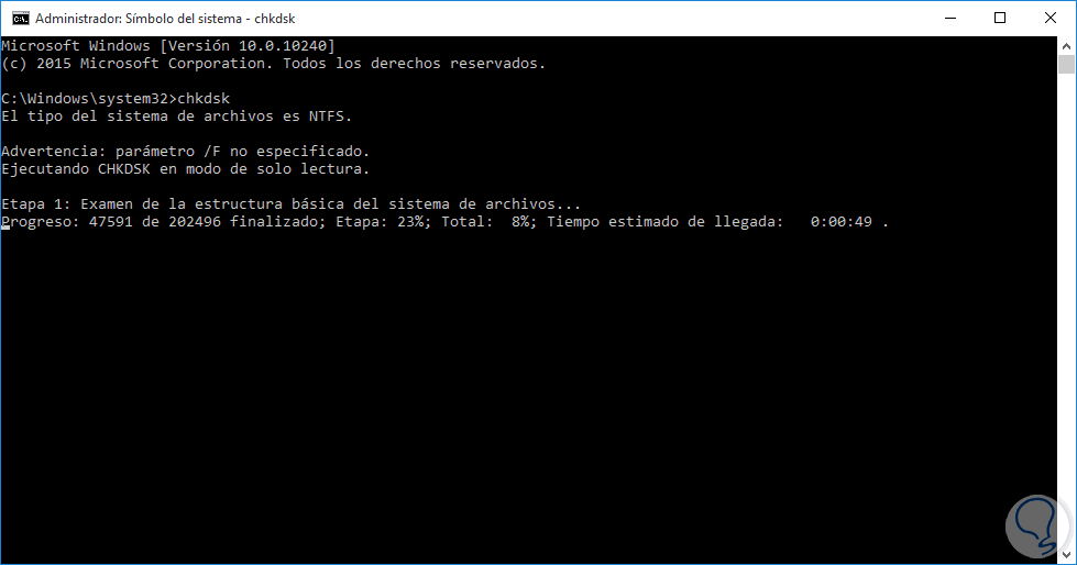 Al usar CHKDSK sin ningún parámetro será posible ver la información del tipo de disco y la integridad del sistema mas no llevar a cabo ninguna acción de soporte sobre él.