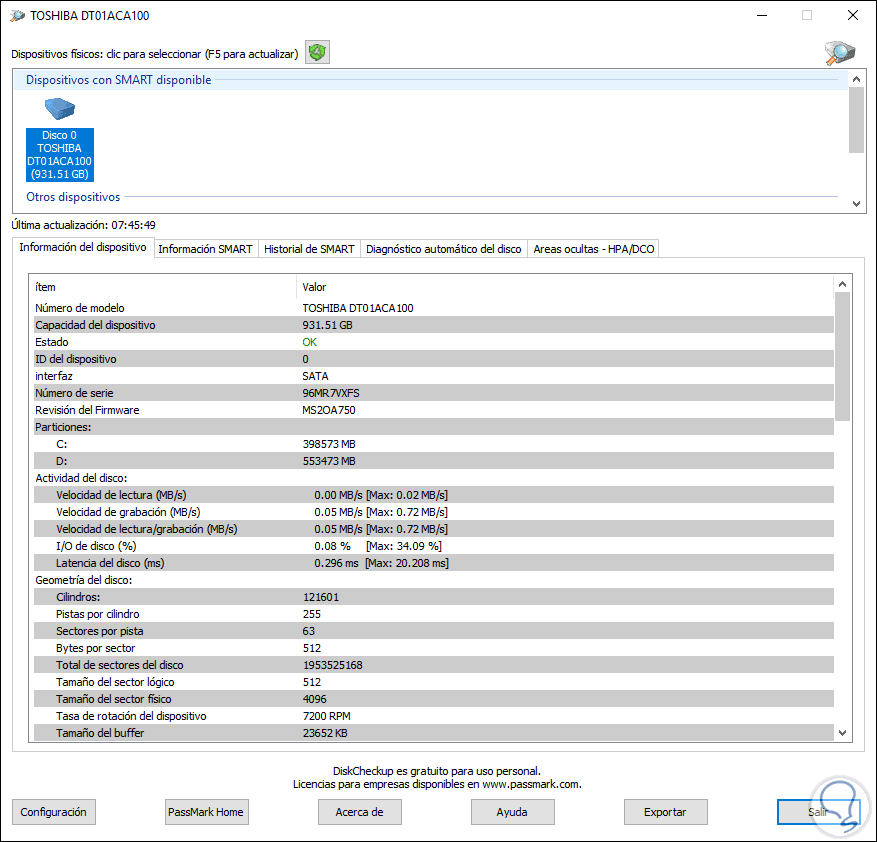Esta utilidad gratuita toma toda la información generada por la tecnología S.M.A.R.T. para facilitar al usuario un informe completo sobre el estado del disco duro y así conocer si se necesita o no tomar acciones inmediatas sobre él.