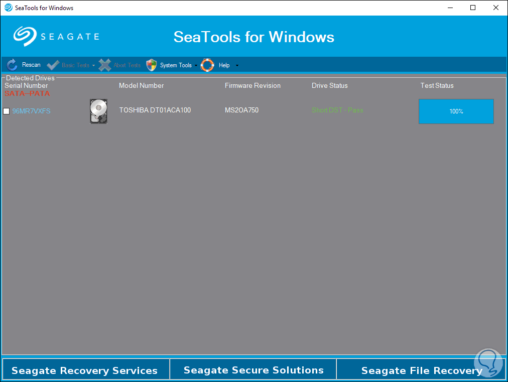 Por ejemplo, usaremos SEAtools, esta herramienta reconoce automáticamente la unidad de disco duro conectada y nos brinda la opción de ejecutar los siguientes tipos de pruebas: