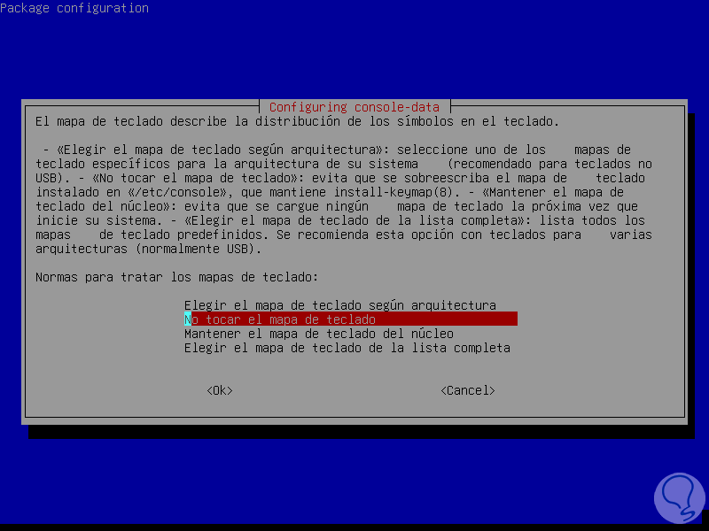 Seleccionamos nuestro idioma y pulsamos "Enter" para confirmar y luego definimos los parámetros del teclado: