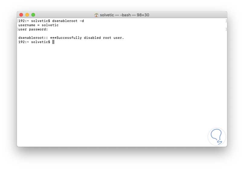 Solvetic recomienda que este usuario sólo sea habilitado por temas de soporte y por personal confiable y es mas que necesario que una vez se completen las tareas a ejecutar se proceda con la deshabilitacion del usuario root para evitar cambios indebidos en macOS Mojave.