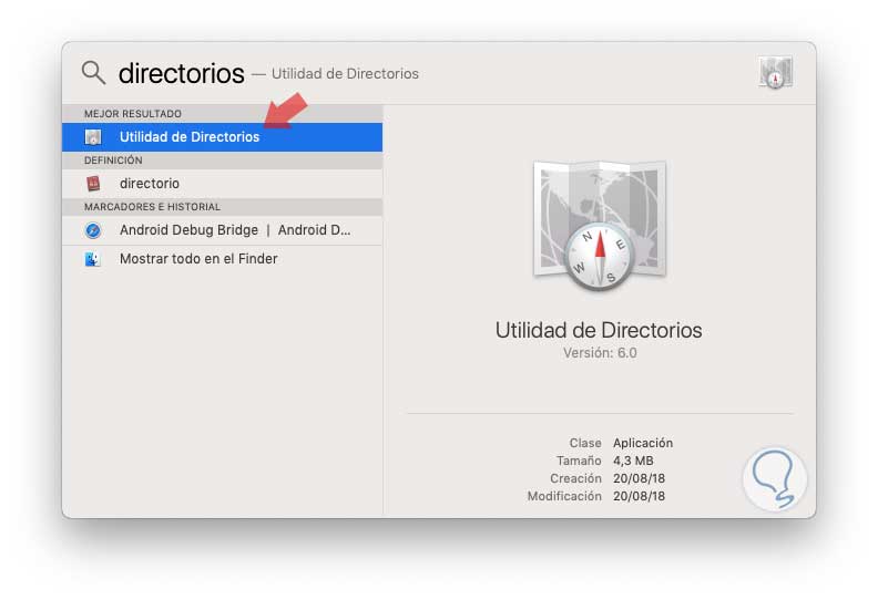Será posible conectarnos a Open Directory, Active Directory o a un servidor de directorio LDAP. Para hacer uso de esta opción, ingresamos a Spotlight y digitamos la palabra directorio y será desplegado lo siguiente.