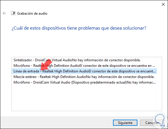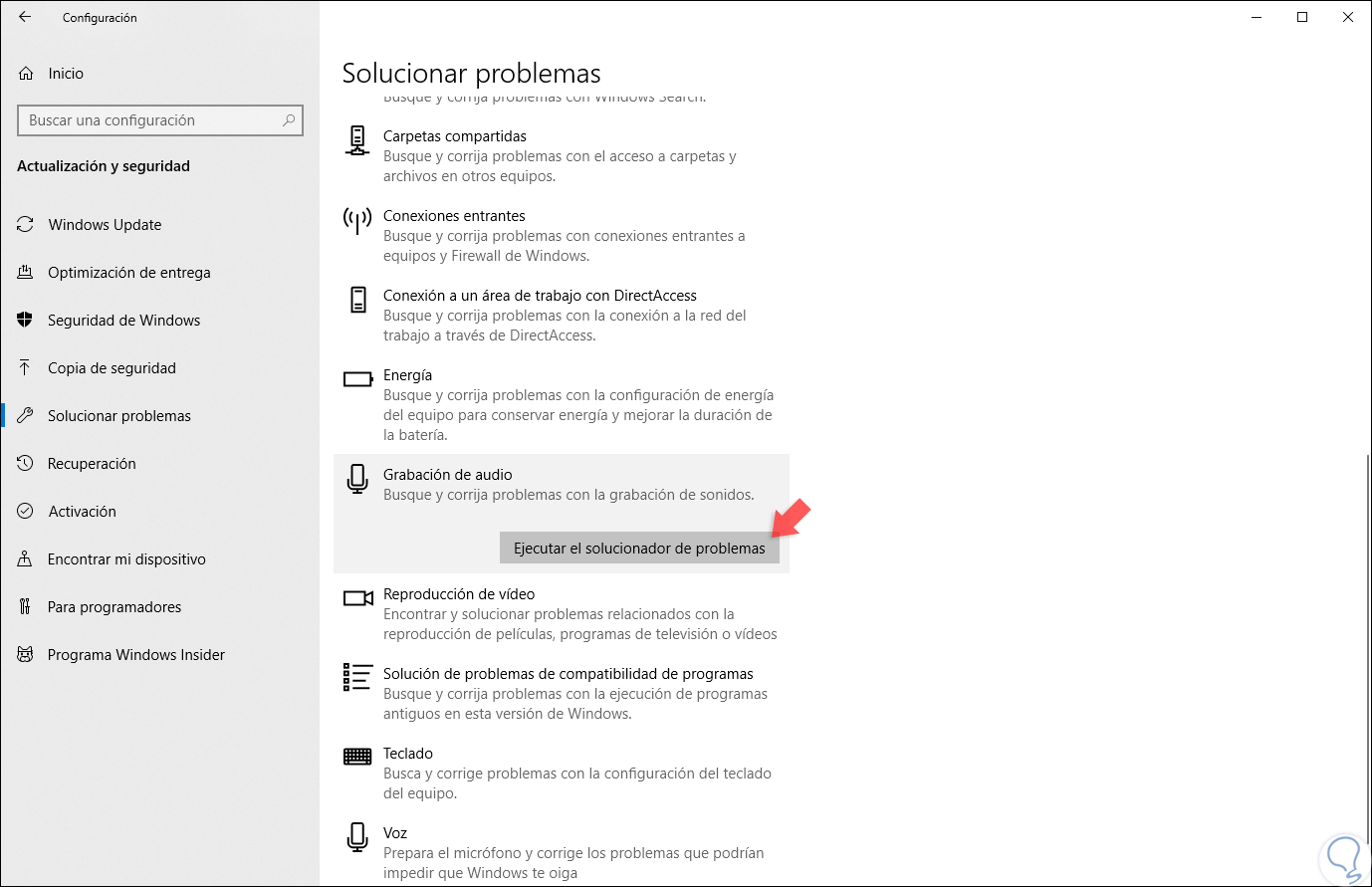Allí ubicamos la línea “Grabador de audio”, damos clic sobre él y pulsamos en el botón “Ejecutar el solucionador de problemas”: