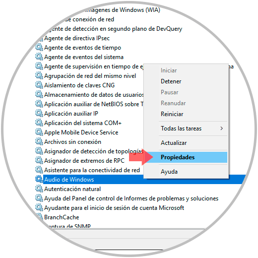 Pulsamos Enter o Aceptar y en la ventana desplegada ubicamos el servicio llamado “Audio de Windows”, daremos doble clic o clic derecho sobre él y seleccionamos la opción “Propiedades”: