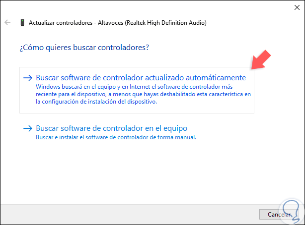 Al seleccionar la opción para actualizar el controlador será posible actualizarlo de dos formas. Allí será posible actualizar el controlador de audio y de este modo comprobar si funciona de forma correcta el medio de audio en Windows 10.