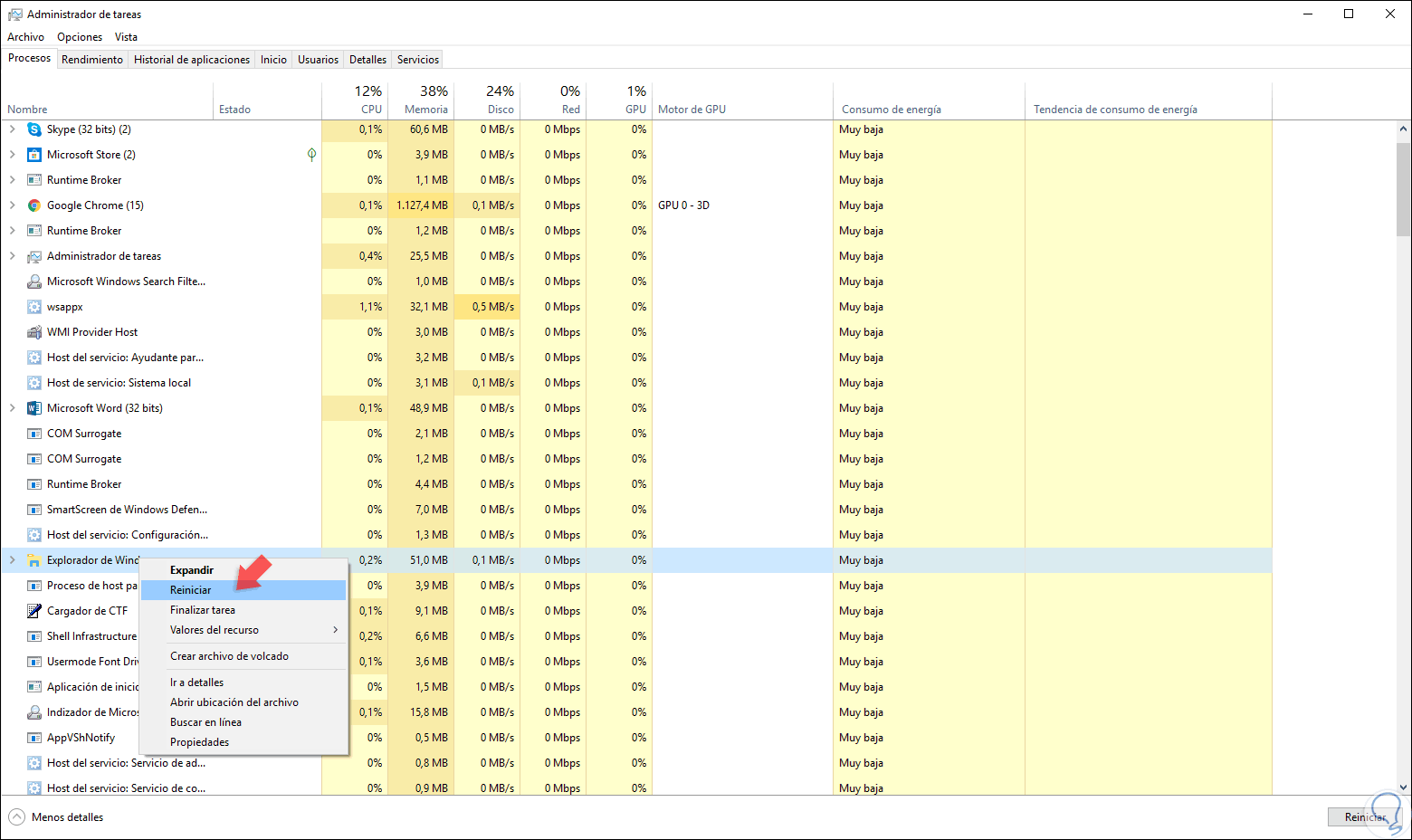 Allí, en el administrador, iremos a la pestaña “Procesos” y ubicaremos el Explorador de Windows y para su reinicio contamos con las siguientes opciones: