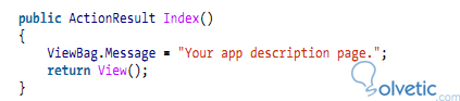 En este caso la acción del controlador tiene por nombre Index, por lo que nuestra vista debe poseer dicho nombre, luego construimos el contenido que queremos que se vea, en este caso lo hacemos con ViewBag.Message y por último utilizamos el método helper View() para generar el ViewResult correspondiente.