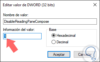 Allí damos doble clic sobre el valor DisableReadingPaneCompose y establecemos su valor en uno (1):