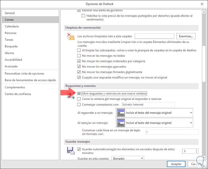En la ventana emergente iremos a la categoría "Correo" y en el panel central ubicamos la sección "Respuestas y reenvíos", allí debemos activar la casilla "Abrir respuestas y reenvíos en una nueva ventana". Pulsamos en "Aceptar" para guardar los cambios.