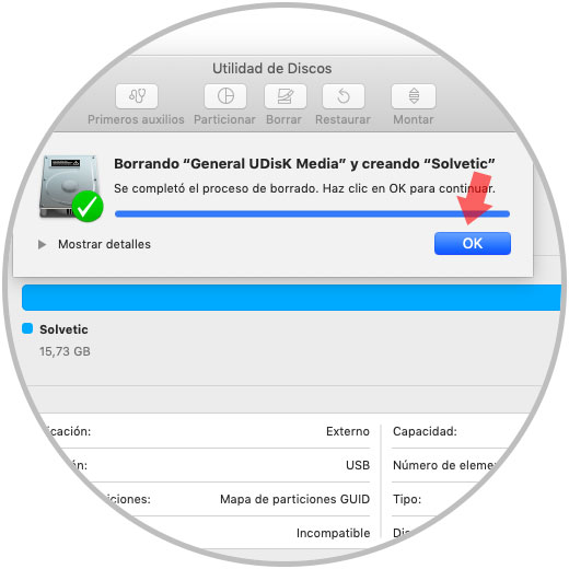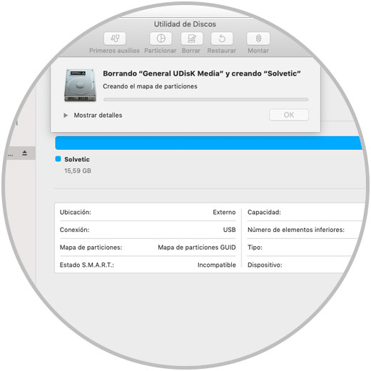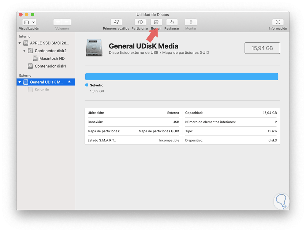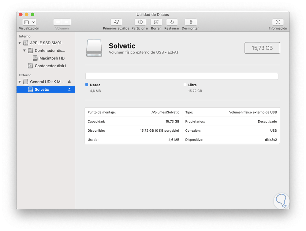 Ahora, desde la utilidad de discos podremos ver las características del medio conectado como su capacidad y formato aplicado: