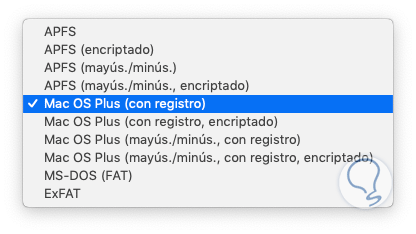 Se desplegará la siguiente ventana emergente donde debemos tener presente los tipos de formato disponible para macOS Mojave que son: