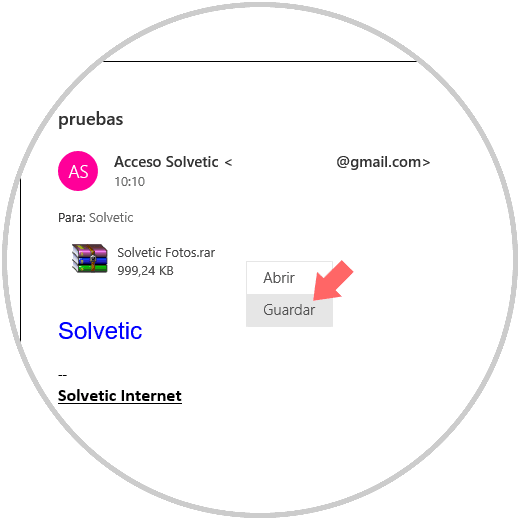 En la aplicación seleccionada, en este caso Correo, daremos clic derecho sobre el adjunto y seleccionamos la opción Guardar: