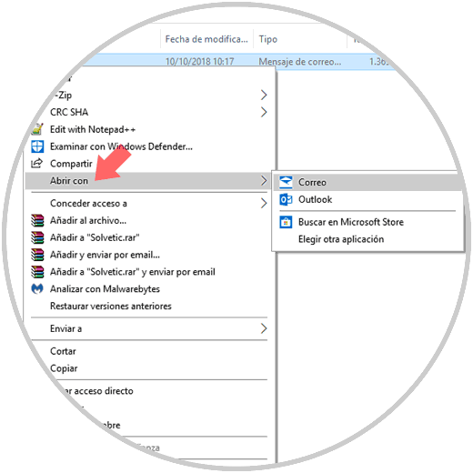 Definido esto pulsamos en el botón Guardar. Ahora, vamos a la ruta donde se ha guardado el archivo, damos clic derecho sobre el y seleccionamos la opción Abrir con y definimos con cual aplicación de correo será abierto: