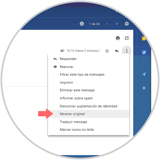 Para esto, debemos acceder a nuestra cuenta de Gmail en el navegador y al acceder al correo donde se encuentra el archivo adjunto, pulsamos en el icono de menú del correo (tres puntos horizontales) y seleccionamos la opción Mostrar original: