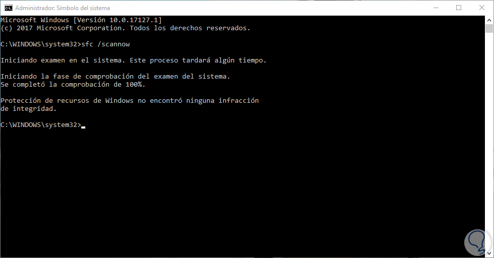 Otra de las herramientas integradas de Windows 10 para tareas de mantenimiento es SFC (System File Checker), la cual analiza y repara el sistema de archivos, para su uso, accedemos de nuevo como administradores al símbolo del sistema y ejecutamos lo siguiente: