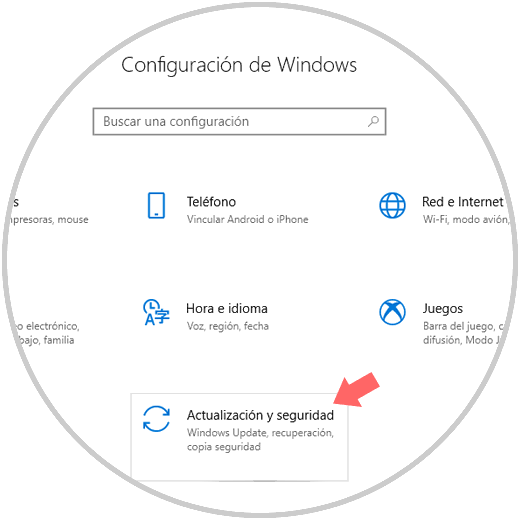 Para comprobar si existen nuevas actualizaciones, iremos al menú "Inicio" y allí seleccionamos la utilidad "Configuración", veremos lo siguiente. Accedemos a la categoría "Actualización y seguridad".
