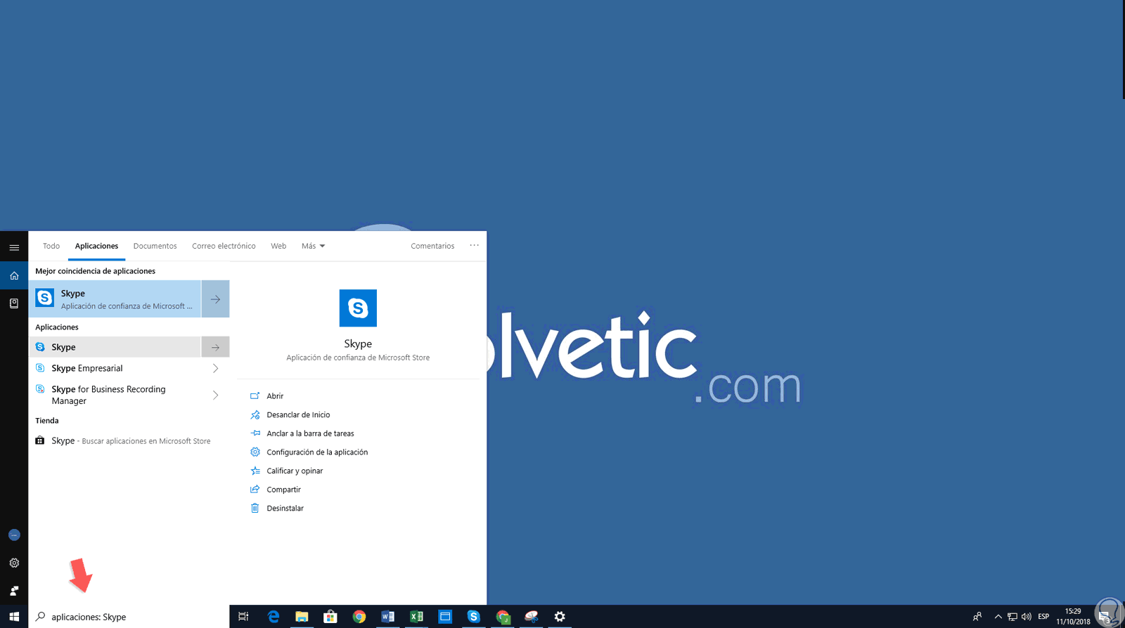 Allí damos clic en la opción “Aplicaciones” y automáticamente en el cuadro de búsqueda aparecerá la leyenda “aplicaciones”: y basta con ingresar el termino deseado para desplegar todos los resultados similares: