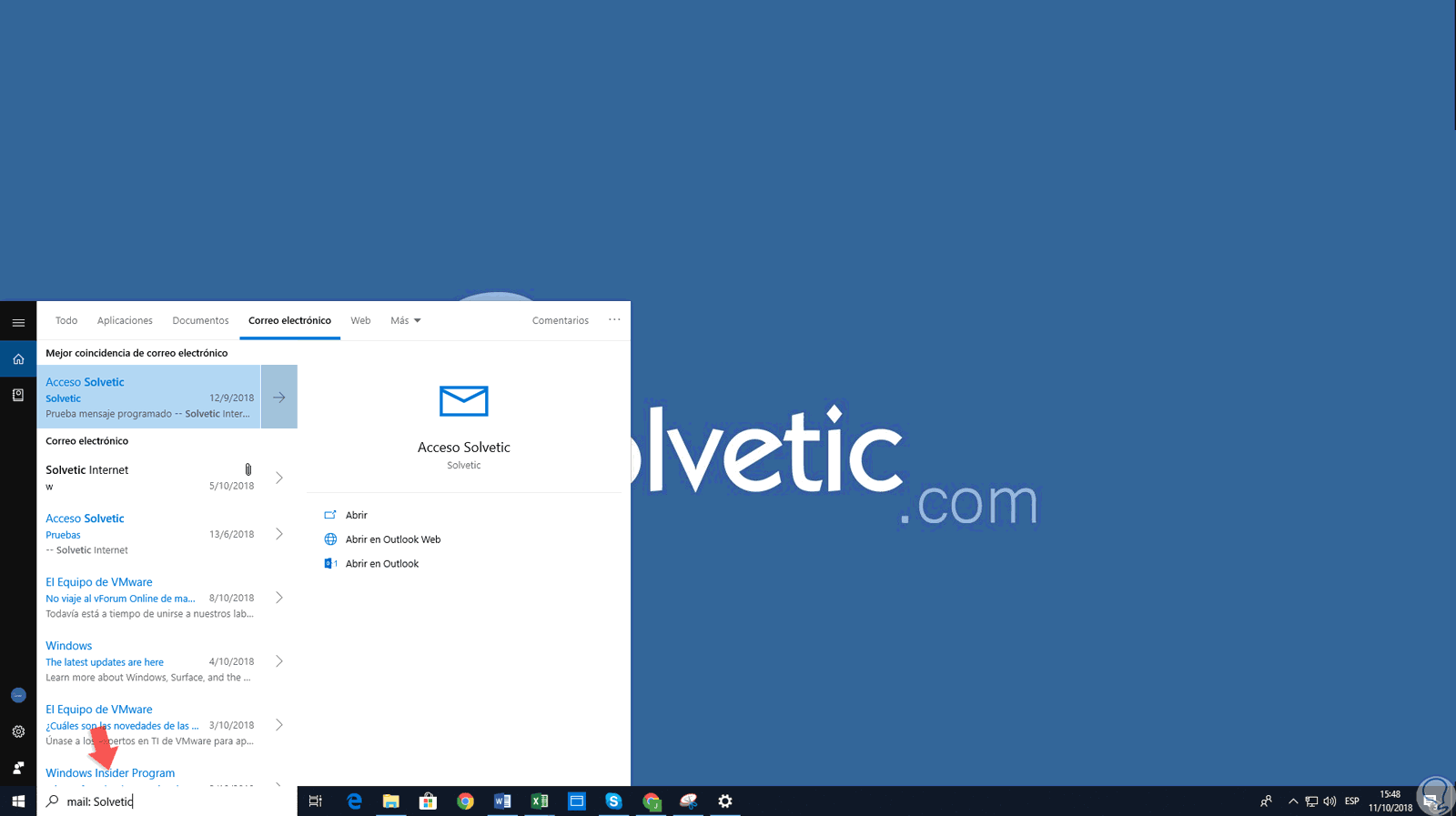 Otra de las novedades de esta búsqueda en Windows 10 es la capacidad de detectar correos electrónicos ya que el cuadro de búsqueda realiza esta búsqueda con la aplicación Correo y Calendario. Para ello usaremos la condición “mail:” seguida de la palabra clave para acceder a los diversos resultados. Allí podemos seleccionar el correo electrónico deseado y hacer uso del panel de vista previa para abrirlo con el navegador o aplicación de correo electrónico preferida.