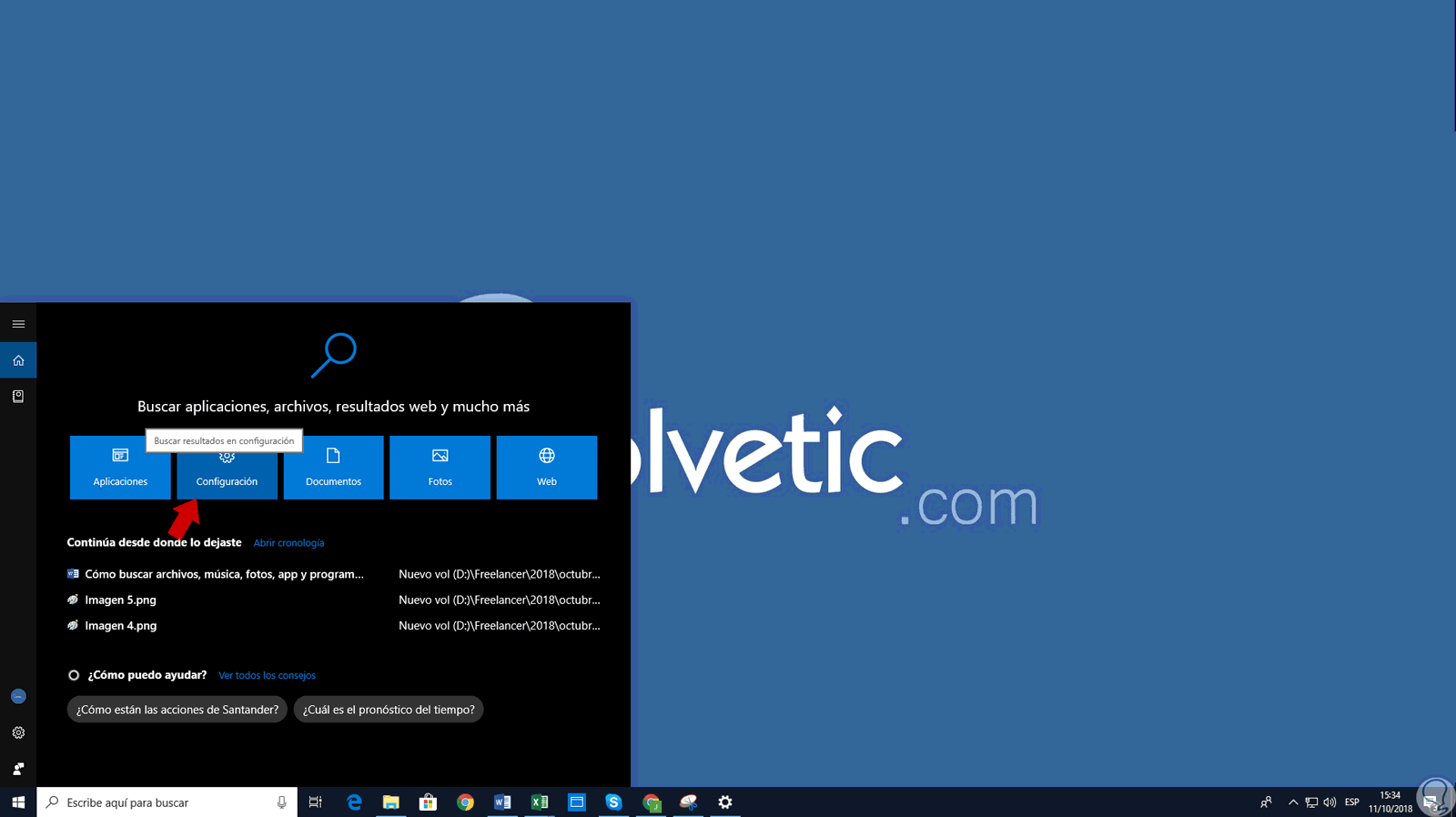 Para acceder a estos resultados damos clic en el cuadro de búsqueda y en la ventana desplegada damos clic en la opción “Configuración:”