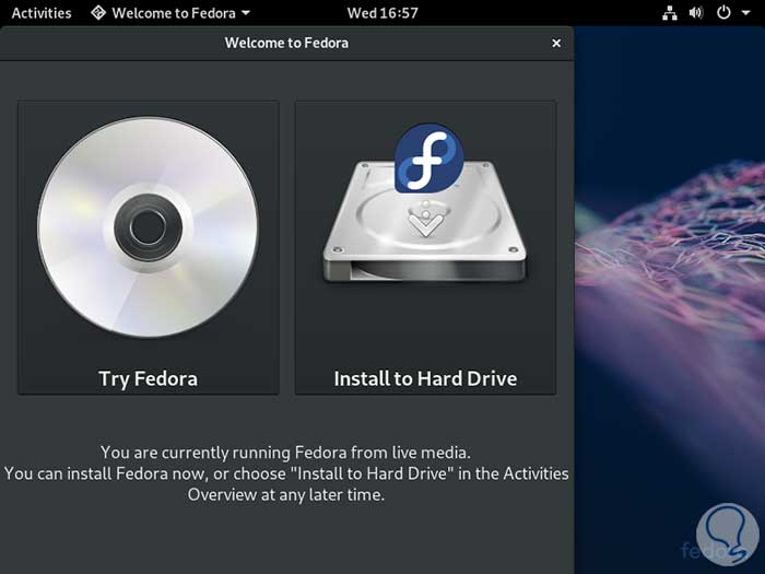 Allí podemos pulsar en la opción Try Fedora para analizar todo el entorno de Fedora 29 pero cualquier cambio que hagamos automáticamente se eliminara al apagar o cerrar la sesión. Si optamos por usar la opción Install to Hard Drive procederemos a instalar Fedora 29 Beta de forma local y poder realizar cambios sin perderlos.