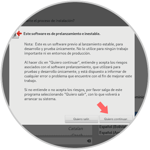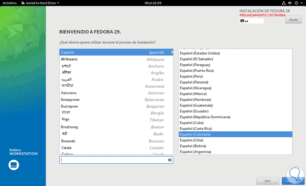 Seleccionamos la opción Install to Hard Drive y seremos redireccionados a la siguiente ventana donde definiremos el idioma a usar con Fedora 29:
