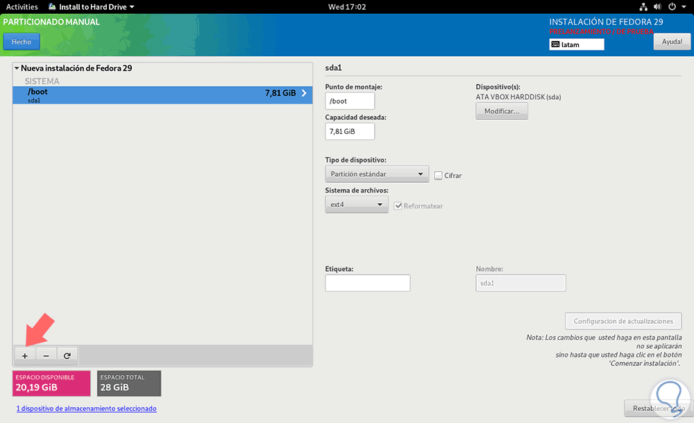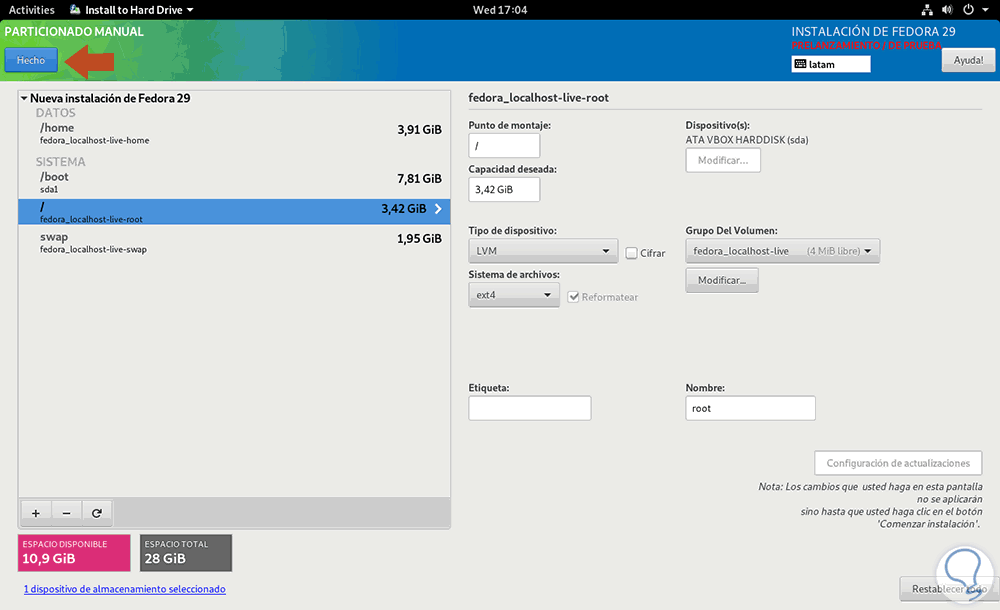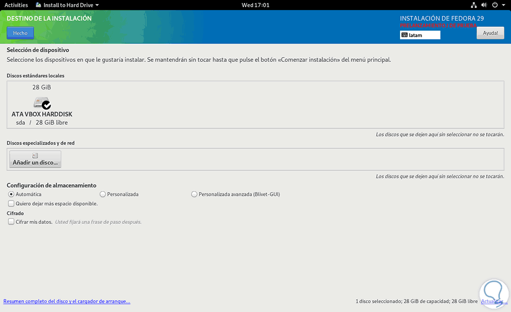 Como vemos, debemos gestionar la opción Destino de la instalación, al pulsar allí veremos el disco o los discos conectados y debemos seleccionar en cual de ellos ser ha de instalar el sistema Fedora 29: