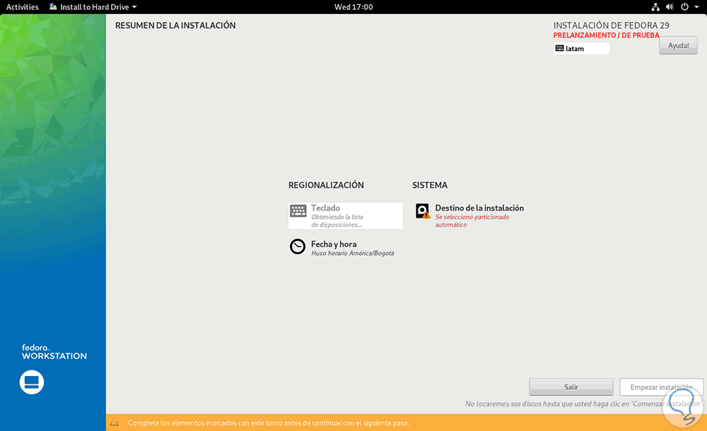 Pulsamos en el botón Empezar instalación para dar inicio al proceso de instalación de Fedora 29 Beta: