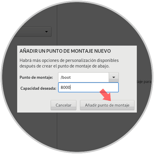 Podemos añadir un disco más usando la opción Añadir un disco y también será posible configurar la forma como se ha de administrar el disco seleccionado, la opción por defecto es Automática. Pero si deseamos particionar el disco podemos activar la casilla Personalizada y al pulsar en el botón Hecho veremos el disco con su espacio libre, allí damos clic en signo + y se desplegará lo siguiente donde definimos el punto de montaje y capacidad a usar para dicho punto: