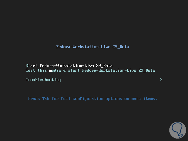 - Test thismedia & start Fedora-Workstation-Live 29 Beta:Con esta opción será posible comprobar los requisitos básicos del sistema y proceder a ejecutar Fedora 29 si todos pasan la prueba