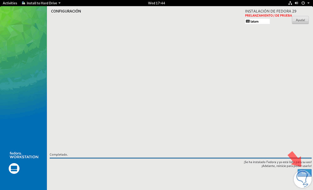 Una vez este proceso finalice veremos el siguiente mensaje. Allí pulsamos en el botón Salir para cerrar el asistente y reiniciar el sistema para tener acceso al entorno de Fedora 29 Beta: