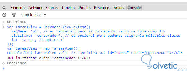 Como podemos ver, creamos una vista de forma básica extendiendo o heredando de Backbone.View, luego con las propiedades mencionadas les asignamos un valor, por último instanciamos y con un console.log() vemos el resultado.