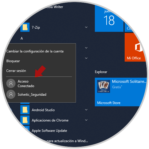 A continuación, podremos cambiar la sesión a la cuenta secundaria cerrando nuestra sesión actual o pulsar en el menú Inicio y allí dar clic sobre el icono de nuestra cuenta y luego pulsar en la segunda cuenta a acceder: