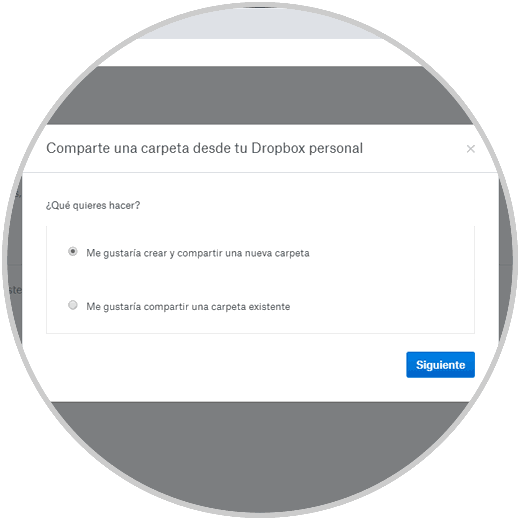 Allí damos clic en la opción Nueva carpeta compartida y se desplegara el siguiente asistente donde debemos definir si vamos a crear y compartir una nueva carpeta o una existente: