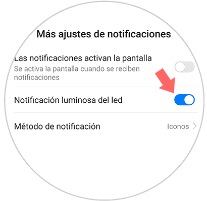Vas a ver una pestaña en la que pone “Notificación luminosa LED”. Si quieres que se ilumine, debes mantenerlo activado con la pestaña desplazada hacia la derecha.
