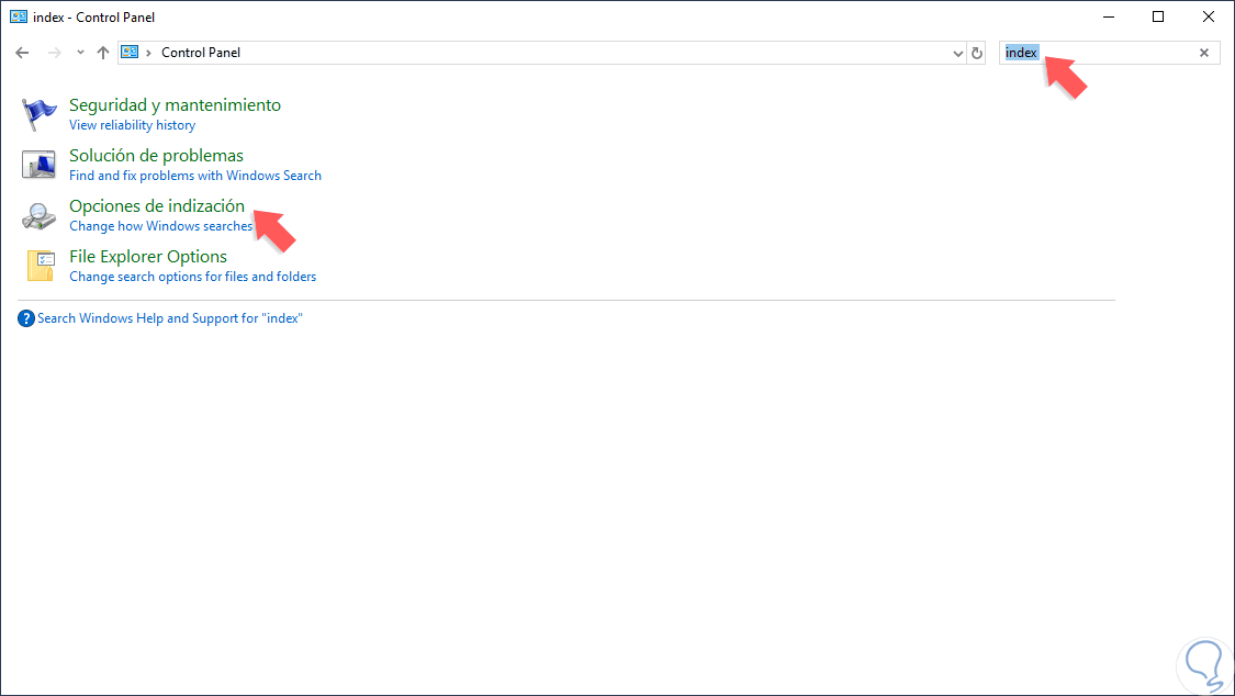 Para usar este método, debemos ir al panel de control y allí ingresar el término “index” en el cuadro de búsqueda ubicado en la parte superior derecha y se desplegarán las siguientes opciones: