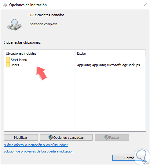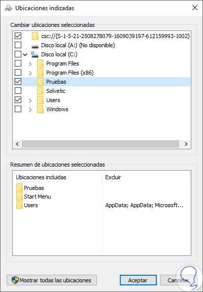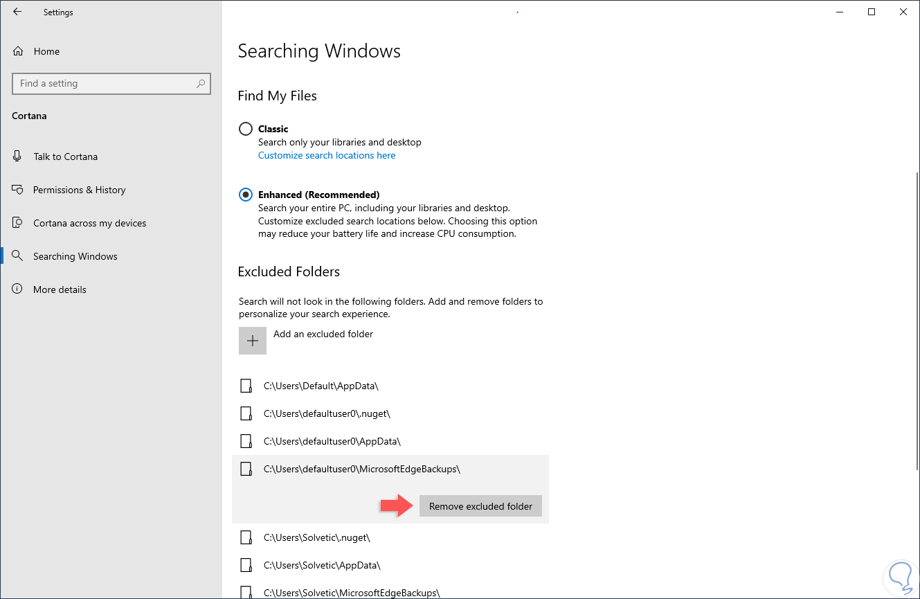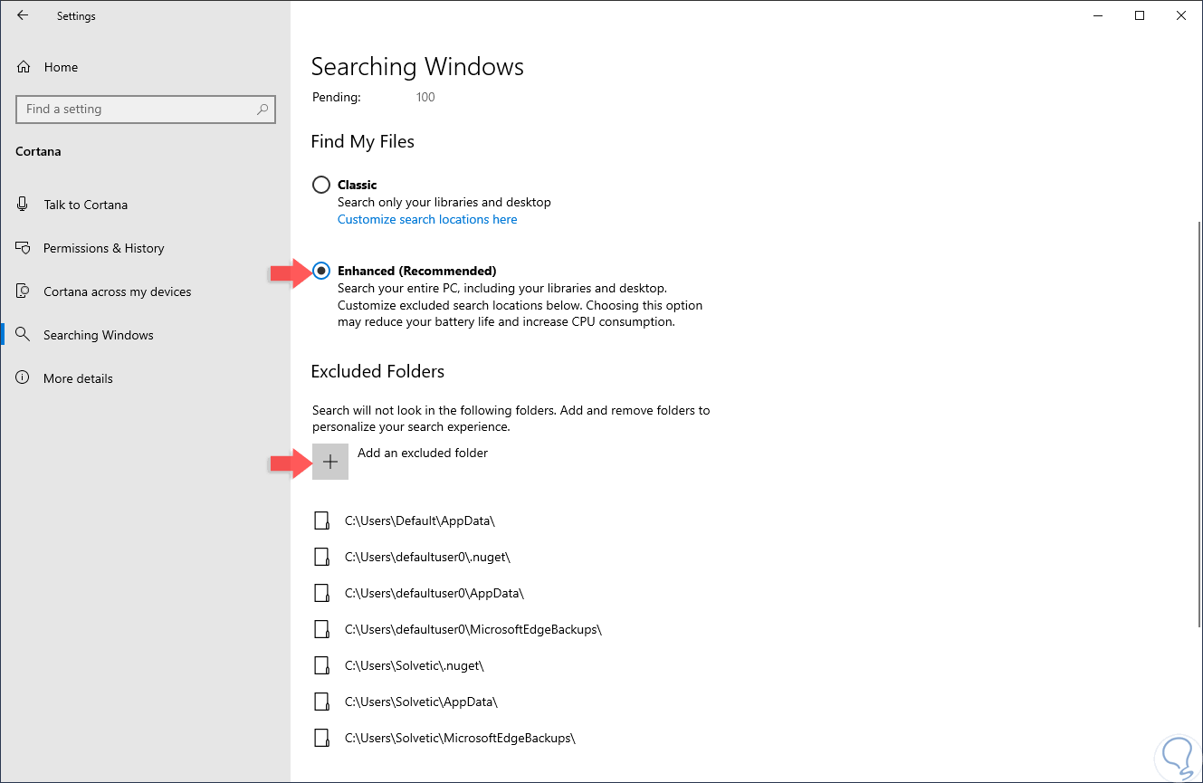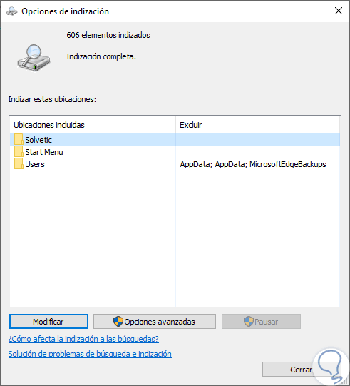 Ahora, dentro de este modo mejorado tenemos la opción de añadir o excluir carpetas del proceso de búsqueda lo cual se traduce en resultados más concretos y mejores tiempos de análisis de estos. Solvetic explicará cómo podemos añadir o quitar una carpeta del proceso de indización en Windows 10.