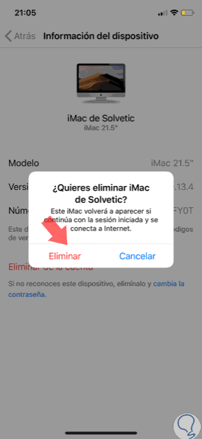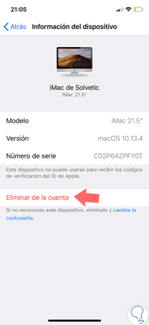 Una vez pulsemos en el dispositivo veremos lo siguiente. Allí pulsamos en la línea "Eliminar de la cuenta".