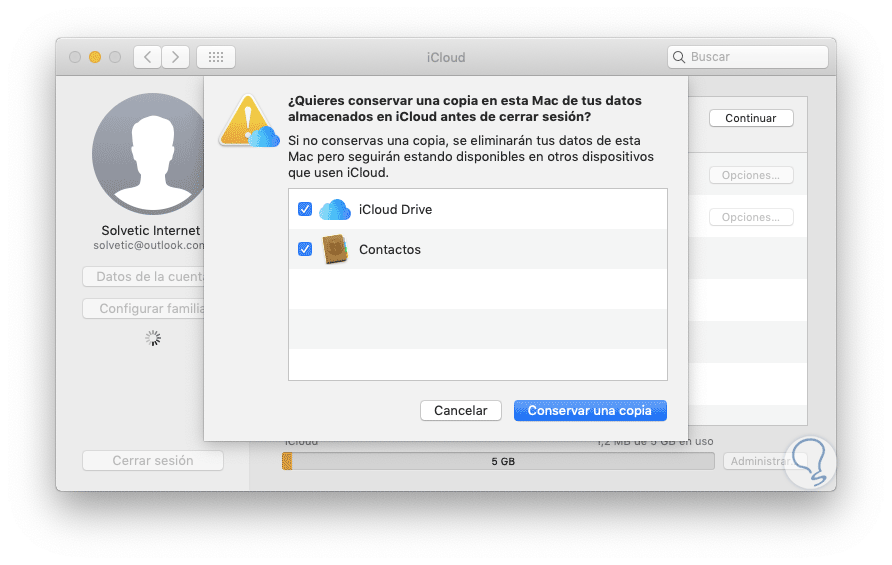Se desplegará la siguiente ventana. Allí podemos pulsar en el botón "Conservar una copia" para crear un respaldo de la información de forma local. Una vez desconectados de la cuenta de Apple ID, el equipo ya no tendrá ninguna de las características, archivos o demás datos relacionados con la ID de Apple disponibles y que hemos borrado.
