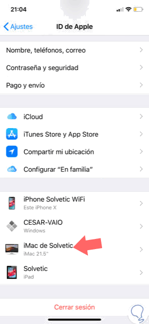 Para ello debemos ir a "Ajustes" y allí pulsar en el campo "Apple ID" y posteriormente seleccionar el dispositivo que vamos a quitar: